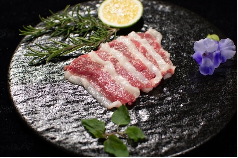 フタエゴは馬肉だけにある部位であり、バラ肉の一種です。 赤身の層が脂身の層に挟まれているため、赤と白の3層のストライプになっているのが大きな特徴です。 あっさりとした甘みがあってトローっと溶ける脂の旨味と、コリコリとした赤身の組み合わせは絶品です。
